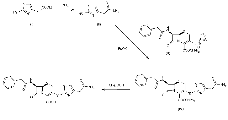 The reaction of 2-(2-sulfanylthiazol-4-yl)acetic acid ethyl ester (I) with ammonia and ammonium chloride gives the corresponding acetamide (II), which is condensed with the cephem methanesulfonate (III) by means of potassium tert-butoxide in dimethoxyethane to yield the diphenylmethyl ester (IV) of the target compound, which is finally hydrolyzed with trifluoroacetic acid and anisole.