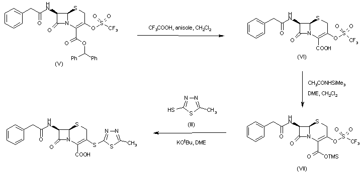 In an alternative method, benzhydryl ester (V) was cleaved with trifluoroacetic acid to give carboxylic acid (VI). After protection of (VI) by means of trimethylsilyl acetamide, the triflate group was displaced by the potassium salt of mercapto thiadiazole (III) to furnish the title compound.