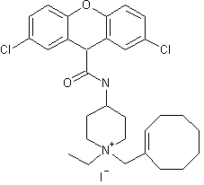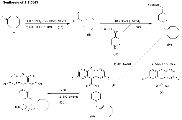 Cyclooctanone tosylhydrazone was treated with n-BuLi and subsequently reacted with DMF to afford (II). Compound (III) was prepared from 4-tert-butoxycarbonylpiperidine by reductive alkylation with (II). Deprotection of (III) and condensation with 2,7-dichloroxanthen-9-carboxylic acid (IV) using 1,1'-carbonyldiimidazole (CDI) afforded (V). Compound (V) was quaternarized with iodoethane to provide a quaternary ammonium derivative as a mixture of two isomers (cis and trans) attributed to the 4-substituted piperidinium structure in a ratio of 2:1. Finally, the mixture was separated by silica gel column chromatography to give a major isomer, J-113863.