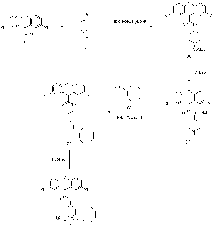 Coupling between 2,7-dichloroxanthene-9-carboxylic acid (I) and 4-amino-1-tert-butoxycarbonylpiperidine (II) in the presence of EDC and HOBt afforded amide (III). After acidic cleavage of the Boc protecting group of (III), the resulting amine (IV) was reductively condensed with 1-cyclooctene carbaldehyde (V) by means of NaBH(OAc)3 to yield the cyclooctenylmethyl amine (VI). Subsequent alkylation of the tertiary amine (VI) with iodoethane gave rise to the target ammonium salt. Separation of the geometric isomers was carried out by column chromatography.
