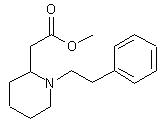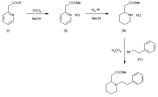 2-Pyridyl acetic acid (I) is converted into its methyl ester derivative (II) by means of SOCl2 in MeOH and then vigorously hydrogenated over Pt in MeOH to afford 2-(2-piperidyl)acetic acid methyl (III). Finally, piperidine ester derivative (III) is alkylated on nitrogen with 2-phenylethylbromide (IV) in DMF in the presence of K2CO3.