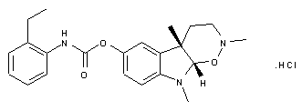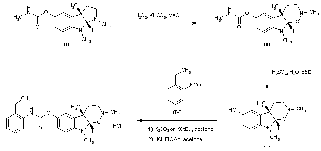 The oxidation of eserine (I) by means of H2O2 and KHCO3 produced the geneseroline carbamate (II), which was hydrolyzed to geneseroline (III) employing 62% sulfuric acid at 85 C. The desired carbamate was then obtained by condensation of (III) with 2-ethylphenyl isocyanate (IV) either in the presence of K2CO3 in acetone or in the presence of t-BuOK under sonication, and the title compound was then isolated as the corresponding hydrochloride salt.