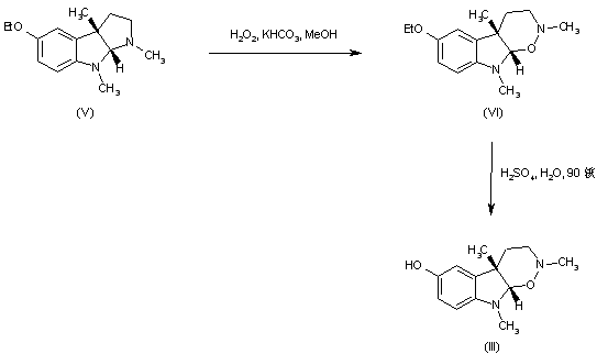 An alternative procedure for the preparation of the intermediate geneseroline (III) consisted in the oxidation of eseretole (V) to geneseretole (VI), followed by ether cleavage by means of concentrated sulfuric acid.