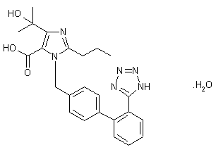 Condensation of diaminomaleonitrile (I) with trimethyl orthobutyrate (II) produced the imino ether (III), which was further cyclized to imidazole (IV) upon heating in xylene. Acid hydrolysis of the imidazole dinitrile (IV) led to diacid (V), and subsequent Fischer esterification with ethanolic HCl provided diester (VI). Regioselective addition of methylmagnesium bromide to diester (VI) furnished the imidazole carbinol (VII). Alkylation of imidazole (VII) with the biphenyl bromide (VIII) furnished the (biphenylylmethyl)imidazole (IX). Then, removal of the trityl protecting group of (IX) under acidic conditions, followed by alkaline ester hydrolysis gave rise to the title compound.