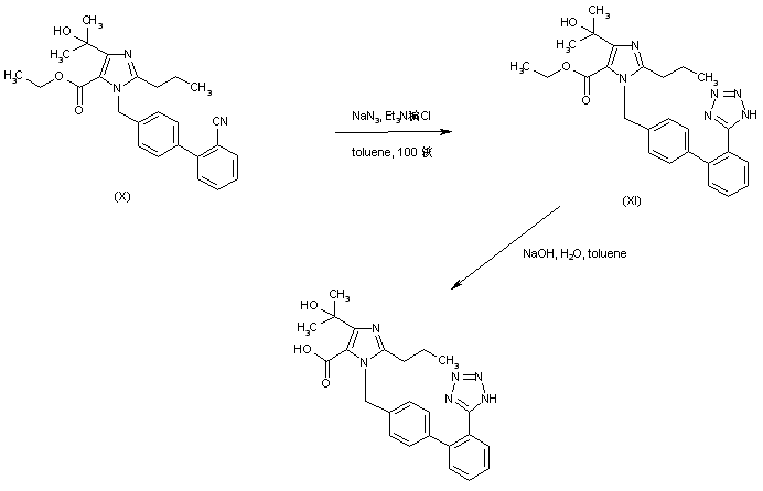 In a further patented method, the biphenylyl nitrile (X) was converted to tetrazole (XI) by dipolar cycloaddition with sodium azide in the presence of triethylammonium chloride. Subsequent basic hydrolysis of the ethyl ester function of (XI) yielded the corresponding carboxylic acid.
