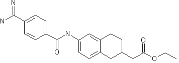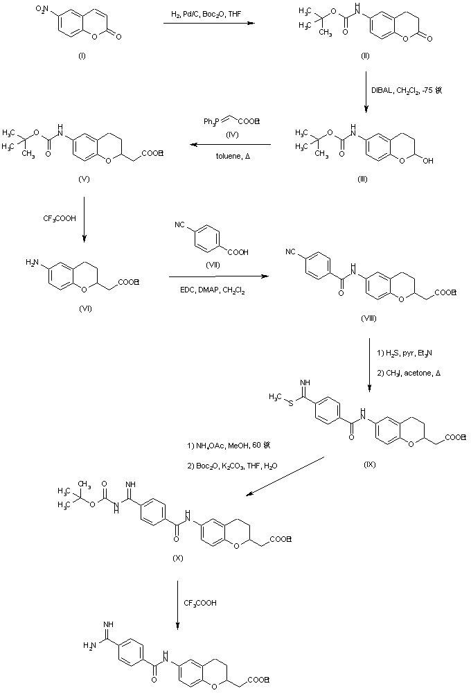 Hydrogenation of 6-nitrocoumarin (I) in the presence of Pd/C and di-tert-butyl dicarbonate provided (II). Partial reduction of the lactone function of (II) with DIBAL at low temperature gave rise to lactol (III), which was submitted to a Wittig condensation with (ethoxycarbonyl)triphenylphosphorane (IV) yielding chromaneacetic acid ethyl ester (V). The Boc protecting group of (V) was then removed with trifluoroacetic acid to afford aniline (VI), which was acylated with 4-cyanobenzoic acid (VII) in the presence of EDC to give amide (VIII). Addition of H2S to the nitrile group of (VIII), followed by S-methylation provided (IX). Then, displacement of the methylthio group of (IX) by ammonium acetate and further treatment with di-tert-butyl dicarbonate yielded the Boc-protected benzamidine (X). Finally, Boc-deprotection with trifluoroacetic acid furnished the title amidino ester.