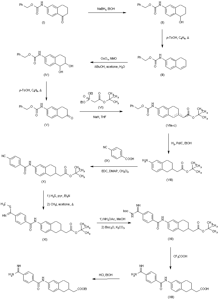 Tetralone (I) was reduced with NaBH4 and the resulting alcohol (II) was dehydrated with p-TsOH in refluxing toluene to yield the dihydronaphthalene (III). Oxidation of (III) with N-methylmorpholine N-oxide and OsO4 produced diol (IV), which was converted to the 2-tetralone (V) by acid-catalyzed rearrangement. The unstable tetralone (V) was condensed with the sodium salt of tert-butyl diethyl phosphonoacetate (VI) providing a mixture of olefin isomers (VII). Catalytic hydrogenation of the olefin (VIIa-c) with simultaneous removal of the carbobenzoxy group furnished the aminotetralin (VIII). This was coupled with 4-cyanobenzoic acid (IX) using EDC to give amide (X). Addition of H2S to the nitrile group of (X), followed by S-methylation provided (XI). Then, displacement of the methylthio group of (XI) by ammonium acetate and further treatment with di-tert-butyl dicarbonate yielded the Boc-protected benzamidine (XII). Deprotection with trifluoroacetic acid produced the amidino acid (XIII), which was finally esterified with EtOH and HCl.