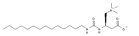 Pentadecanoyl chloride (I) is treated with NaN3 to form the corresponding acyl azide (II), which undergoes Curtius rearrangement to isocyanate (III) upon heating in toluene. Coupling of isocyanate (III) with aminocarnitine (IV) then produces the title urea derivative.