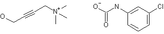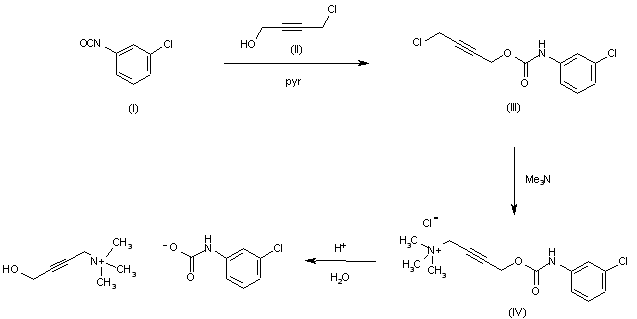 The reaction of m-chlorophenyl isocyanate (I) with 4-chloro-2-butyn-1-ol (II) gives 4-chloro-2-butynyl-N-(3-chlorophenyl)carbamate (III), which is treated with trimethylamine in benzene.