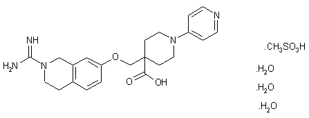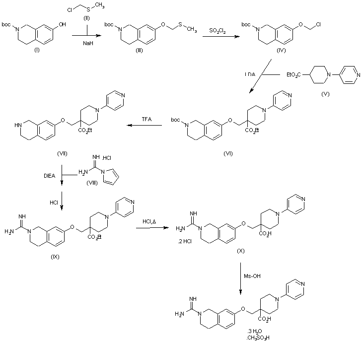 | 合成路线图解说明: Treatment of protected hydroxy tetrahydroisoquinoline (I) with chloromethyl methyl sulfide (II) in DMF in the presence of NaH affords methylsulfanyl derivative (III), which is then converted into chloromethoxy compound (IV) by reaction with sulfuryl chloride in dichloromethane. Condensation of (IV) with piperidine derivative (V) by means of lithium diisopropylamide in THF provides compound (VI), whose Boc group is removed by means of TFA in CHCl3 to furnish deprotected tetrahydroisoquinolinic compound (VII). An amidinium group is then incorporated onto (VII) by reaction with 1H-pyrazole-1-carboxamidine hydrochloride (VIII) to give amidino derivative (IX), whose ethyl ester group is hydrolyzed by refluxing with HCl to afford carboxylic acid (X) as a dihydrochloride salt. Finally, the desired product is obtained by formation of the corresponding monomethanesulfonate trihydrate derivative by treatment with MsOH. |
