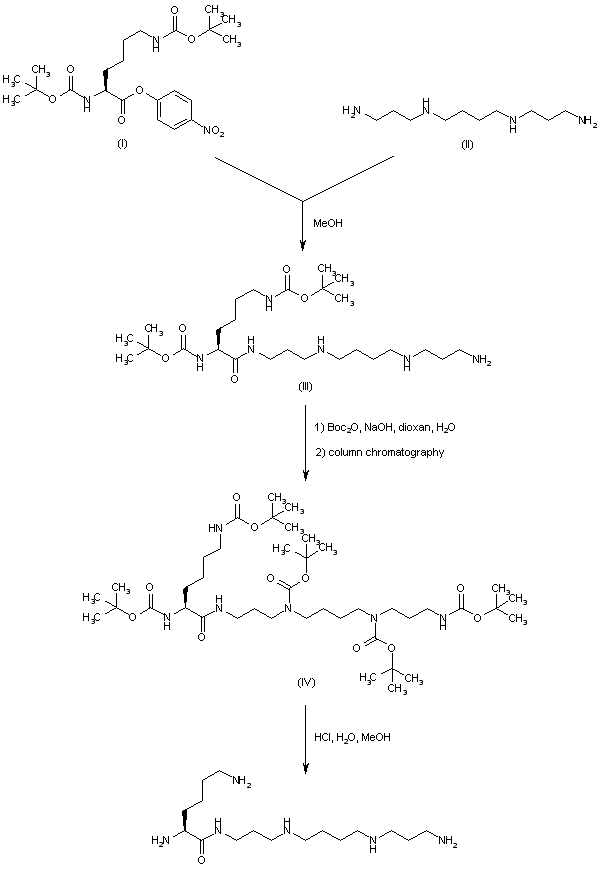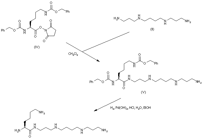 The N-hydroxysuccinimide ester of di-carbobenzyloxy-L-lysine (IV) was coupled to spermine (II), yielding amide (V). The N- carbobenzyloxy groups were then deprotected by catalytic hydrogenolysis in the presence of Pearlman抯 catalyst.