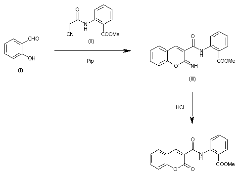 The cyclization of 2-hydroxybenzaldehyde (I) with 2-(cyanacetamido)benzoic acid methyl ester (II) catalyzed by piperidine in ethanol gives the 2-imino-1-benzopyran (III), which is then hydrolyzed to the target benzopyranone with HCl in refluxing ethanol/water.