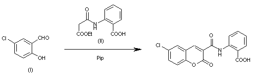 By cyclization of 5-chloro-2-hydroxybenzaldehyde (I) with N-(2-carboxyphenyl) malonamic acid ethyl ester (II) catalyzed by piperidine in ethanol.