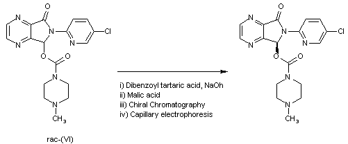 Eszopiclone can also be obtained by optical resolution of zopiclone by several different methods: i) crystallization of the D-(+)-O,O'-dibenzoyltartaric acid salt in acetonitrile, followed by treatment with NaOH in dichloromethane/water; ii) crystallization of the (+)-malic acid salt in MeOH/acetone followed by treatment with KHCO3 in MeOH water and extraction with dichloromethane/ethyl acetate; iii) chiral chromatography over a Chiralpak AS column; iv) capillary electrophoresis in the presence of octakis-(2,3,6-tri-O-methyl)-g-cyclodextrin.