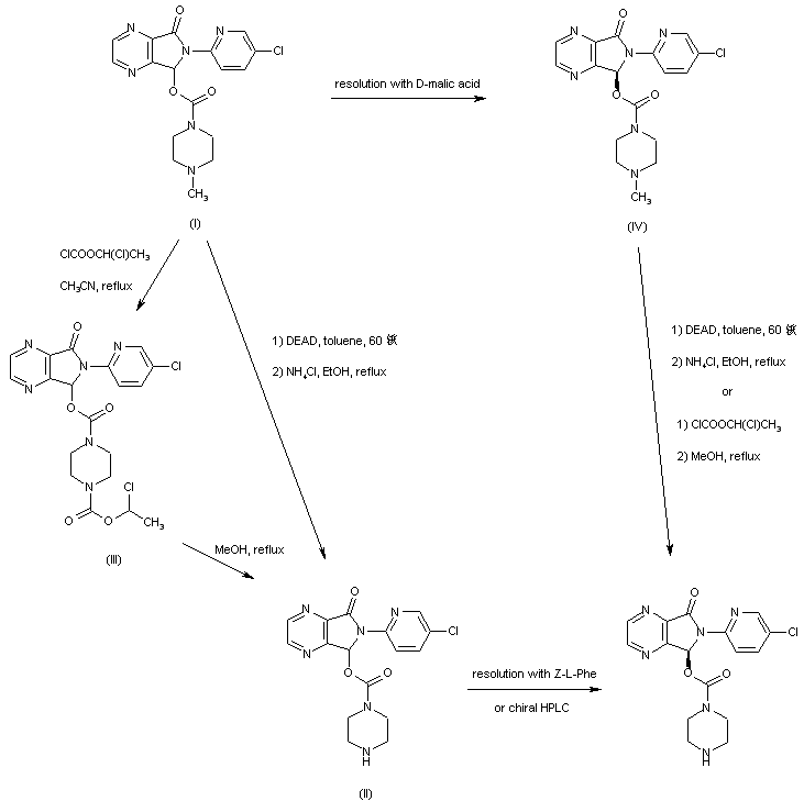 The title compound has been obtained from racemic zopliclone (I) by several related procedures. Demethylation of (I) to afford (II) has been achieved by treatment with diethyl azodicarboxylate (DEAD) in boiling toluene, followed by mild hydrolysis with NH4Cl in refluxing EtOH. In a higher yield demethylation procedure, treatment of (I) with chloroethyl chloroformate produced carbamate (III), which was further hydrolyzed to (II) in boiling MeOH. Resolution of racemic N-demethyl zopiclone (II) has been accomplished via formation of the diastereomeric salts with N-Z-L-phenylalanine or, alternatively, by means of semi-preparative chiral HPLC. In a related strategy, racemic zopiclone (I) was first resolved using D-malic acid to provide the (S)-enantiomer (IV). This was then dealkylated by means of either DEAD or employing the chloroethyl chloroformate method.