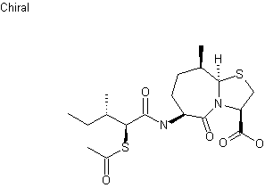 Treatment of 5-methylpyridine-2-carbonitrile (I) with ethanol and sulfuric acid gave ester (II), which was further hydrolyzed to carboxylic acid (III) using aqueous HCl. Hydrogenation of the pyridine ring of (III) over PtO2 yielded a 3:1 mixture of cis and trans piperidines as the corresponding hydrochloride salts (IVa-b). Liberation of the free base of (IVa-b) by means of Et3N in a suspension in CH2Cl2 allowed the separation of the racemic cis isomer, which was N-acylated with Ac2O to give acetamide (V). Esterification of (V) with isobutylene in the presence of H2SO4 afforded the tert-butyl ester (VI). The electrochemical oxidation of (VI) in MeOH produced the 6-methoxy piperidine (VII). Ring opening of the piperidine (VII) with formation of the thiazolidine ring upon treatment with methyl L-cysteinate (VIII) generated the tert-butoxycarbonylbutyl thiazolidine (IXa-h) as a complex mixture of diastereoisomers. After cleavage of the tert-butyl ester of (IXa-h) with trifluoroacetic acid, cyclization using 2-ethoxy-1-ethoxycarbonyl-1,2-dihydroquinoline (EEDQ) gave rise to the thiazoloazepine bicyclic system (Xa-d). Column chromatography of the resulting diastereomeric mixture provided the (6S,9R) and (6S,9S) isomers in a 1:2 ratio. Hydrolysis of this mixture with methanolic HCl yielded the bicyclic amine (XIa-b). Coupling of (XIa-b) with (2S,3S)-2-acetylthio-3-methylpentanoic acid (XII) gave the corresponding mixture of amides, from which the desired isomer (XIII) was isolated by column chromatography. Hydrolysis of methyl ester and thioacetate ester groups of (XIII) using LiOH, followed by S-acetylation with Ac2O in the presence of CoCl2 gave rise to the title compound.