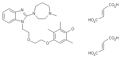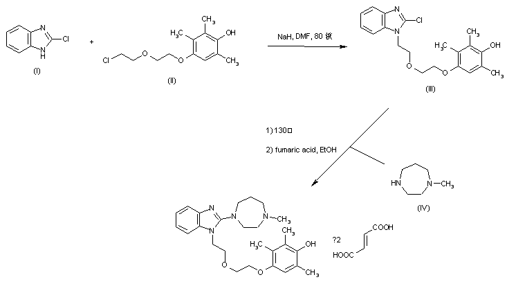 2-Chlorobenzimidazole (I) was treated with NaH in DMF and the resulting sodium salt was alkylated with 4-[2-(2-chloroethoxy)ethoxy]-2,3,6-trimethylphenol (II) to give (III). Subsequent displacement of the chlorine of (III) with N-methyl homopiperazine (IV) at 130 C produced the desired 2-(homopiperazino)benzimidazole, which was finally treated with fumaric acid in EtOH to yield the corresponding bis fumarate salt.