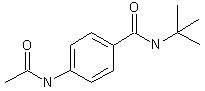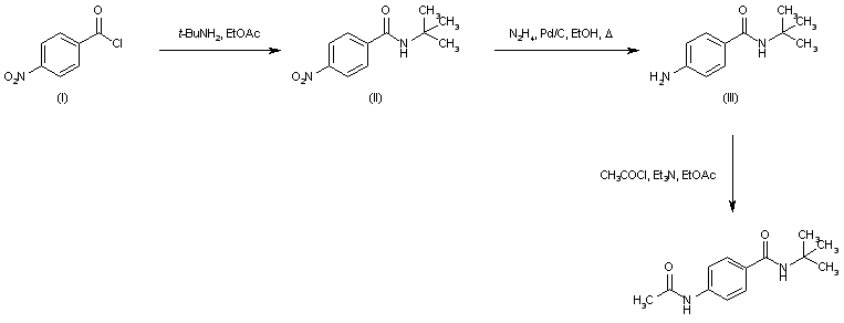 4-Nitrobenzoyl chloride (I) was condensed with tert-butyl amine to give amide (II). The nitro group of (II) was then reduced to aniline (III) by transfer hydrogenation with hydrazine and Pd/C. Finally, acylation of (III) with acetyl chloride provided the title acetamide.