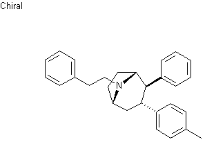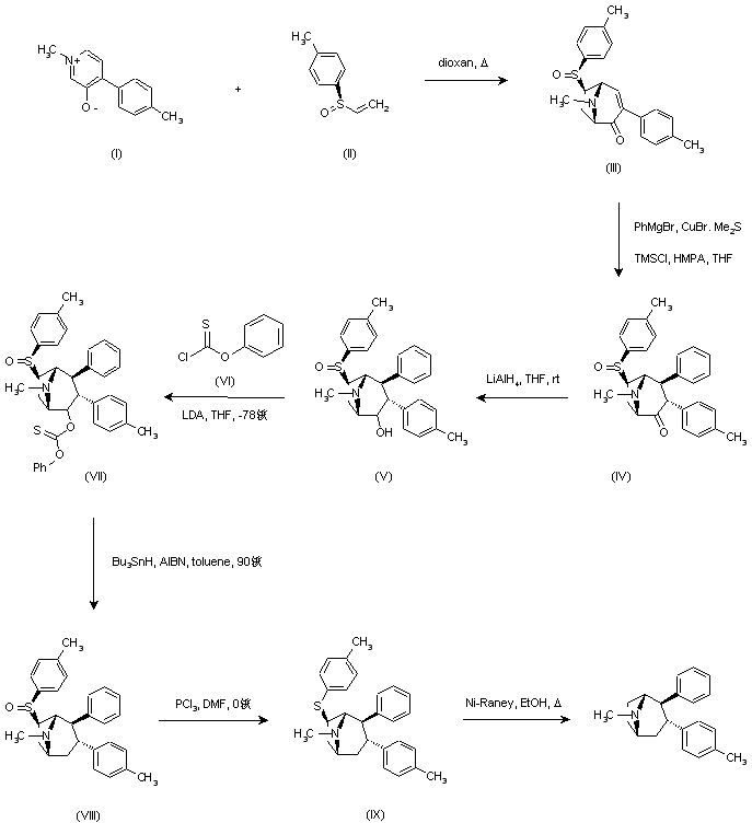 Dipolar cycloaddition of hydroxypyridinium betaine (I) with R-(+)-p-tolyl vinyl sulfoxide (II) furnished the chiral tropenone (III). Subsequent copper-catalyzed conjugate addition of phenyl-magnesium bromide on the beta-face of (III) provided the trans diaryltropanone (IV). Then, ketone reduction of (IV) with LiAlH4 gave alcohol (V), which was condensed with phenyl thionochloroformate (VI) to afford thiocarbonate (VII). This was reduced with tributyltin hydride and azobis(isobutyronitrile) to produce tropane (VIII). The sulfoxide group of (VIII) was further reduced to sulfide (IX) with PCl3 in DMF. Finally, Raney Nickel-promoted desulfurization in boiling EtOH yielded the title compound.