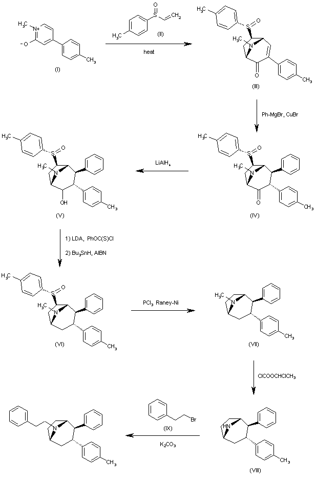 The cycloaddition of the oxidopyridinium (I) with p-tolyl(vinyl)sulfoxide (II) in refluxing dioxane gives the tropenone derivative (III), which is treated with phenylmagnesium bromide and CuBr in THF yielding the diaryl tropanone derivative (IV). The reduction of (IV) with LiAlH4 in THF affords the corresponding alcohol (V), which is deoxigenated by reaction first with O-phenyl chlorothioformate and then with tributyltin hydride and AIBN in hot toluene to provide the diaryltropane (VI). The elimination of the sulfoxide group of (VI) with PCl3 and Raney-Ni in refluxing ethanol gives the diaryl tropane (VII) (1), which is submitted to N-demethylation with alpha-chloroethyl chloroformate and proton sponge in refluxing dichloroethane yielding the intermediate (VIII), which is finally N-alkylated with 2-phenylethyl bromide (IX) and K2CO3 in DMF.