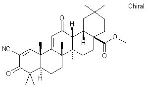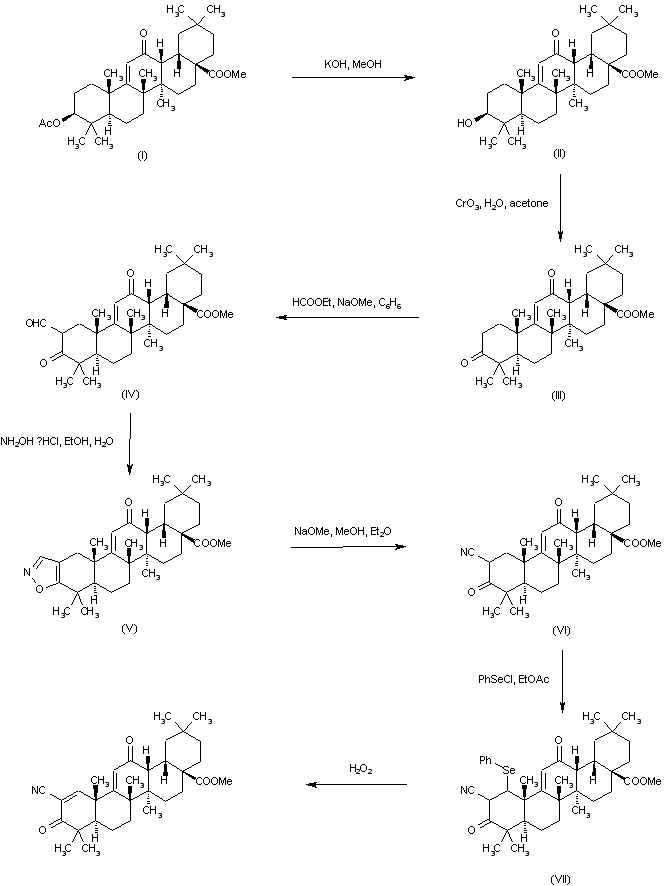 Selective hydrolysis of the acetate ester from oleanoic acid derivative (I) by means of methanolic KOH afforded alcohol (II), which was oxidized to the corresponding ketone (III) with Jones reagent. Claisen condensation of (III) with ethyl formate in the presence of NaOMe produced ketoaldehyde (IV). Isoxazole derivative (V) was then obtained by cyclization of (IV) with hydroxylamine. Subsequent cleavage of the isoxazole ring of (V) with sodium methoxide gave rise to keto nitrile (VI). The title alpha,beta-unsaturated nitrile was then obtained by conversion of (VI) to the phenylselenyl derivative (VII), followed by oxidation with H2O2 and elimination of the resulting selenoxide.