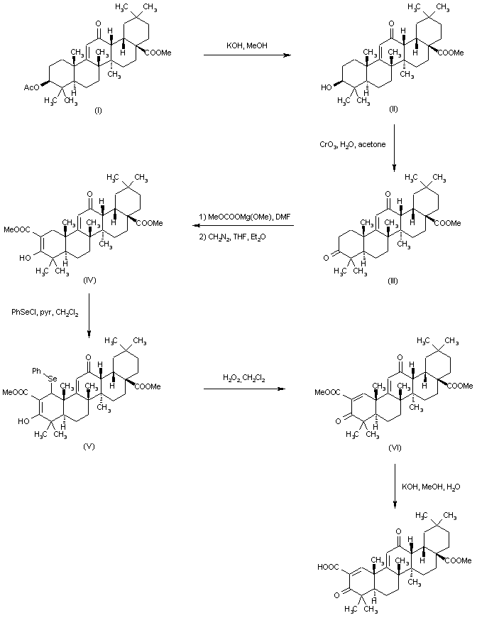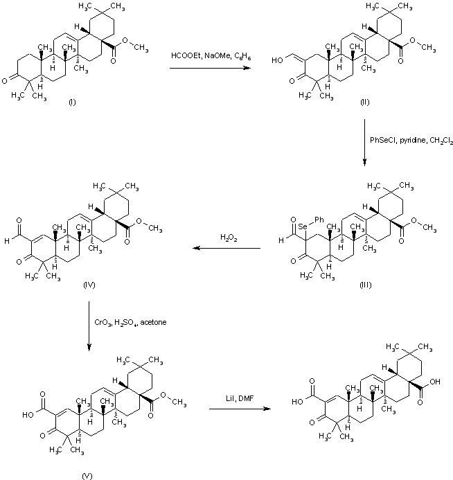 Formylation of methyl 3-oxooleanolate (I) with ethyl formate and NaOMe afforded the (hydroxymethylene)derivative (II). The unsaturated aldehyde (IV) was prepared by selenylation of (II) with phenylselenyl chloride and pyridine, followed by oxidation of the resulting selenide (III) with H2O2 with concomitant elimination of the resulting selenoxide. Jones oxidation of aldehyde (IV) afforded carboxylic acid (V). Finally, hydrolysis of the hindered methyl ester group of (V) was achieved by treatment with lithium iodide in refluxing DMF.