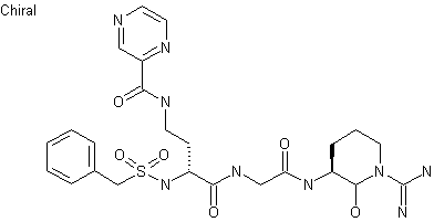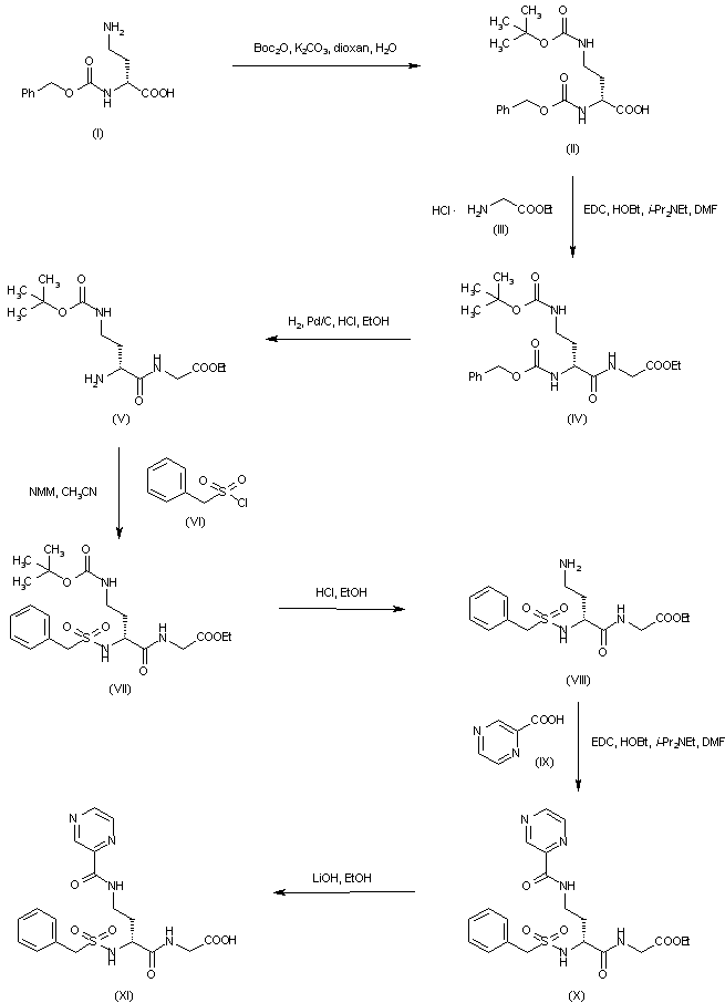 Nalpha-(Benzyloxycarbonyl)-1,4-diaminobutyric acid (I) was protected as the Nomega-Boc derivative (II) and then coupled to glycine ethyl ester (III) by means of EDC and HOBt to produce dipeptide (IV). Hydrogenolysis of the benzyloxycarbonyl group of (IV) to give (V), followed by condensation with alpha-toluenesulfonyl chloride (VI) gave sulfonamide (VII). Side-chain deprotection of (VII) with HCl liberated amine (VIII), which was acylated with 2-pyrazinecarboxylic acid (IX) to afford amide (X). Saponification of the ethyl ester of (X) with LiOH gave carboxylic acid (XI).