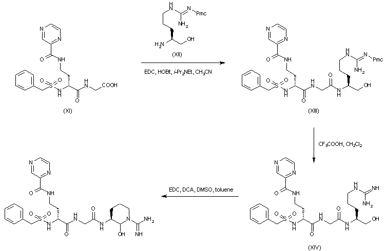 The carboxylic acid (XI) was coupled with Ngamma-Pmc-argininol (XII) giving (XIII). Deprotection of the Pmc group of (XIII) with trifluoroacetic acid provided the free guanidine (XIV). Finally, Swern oxidation of the primary alcohol of (XIV) with concomitant cyclization of the resulting aldehyde furnished the title compound.