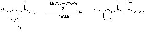 By condensation of 3-chloroacetophenone (I) with dimethyl oxalate (II) by means of NaOMe in methanol.