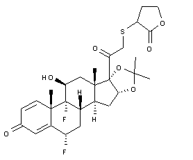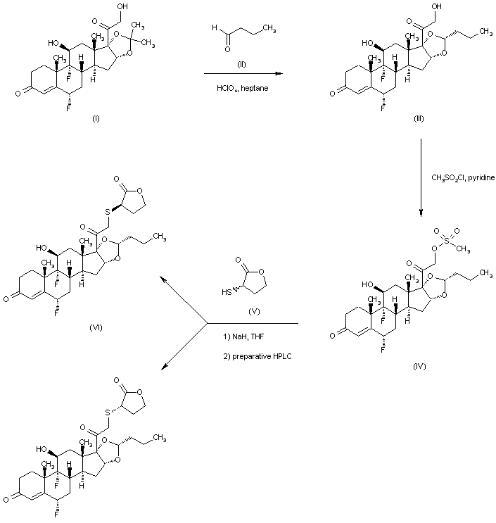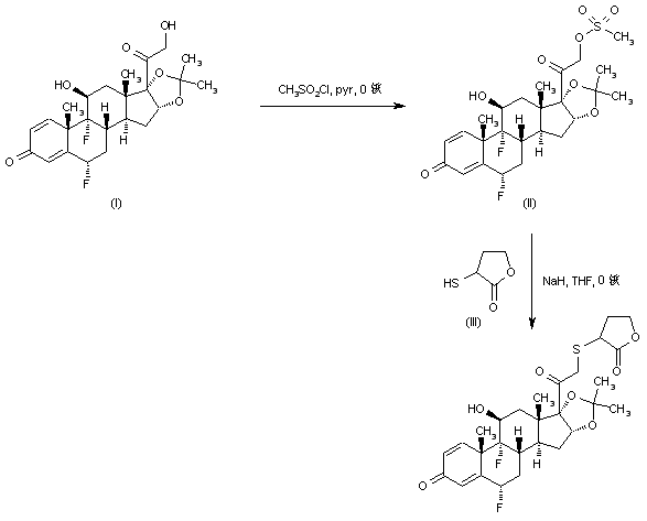 Fluocinolone acetonide (I) was selectively mesylated at the primary alcohol group by means of methanesulfonyl chloride and pyridine. Treatment of the resulting mesylate (II) with alpha-mercapto-gamma-butyrolactone (IV) in the presence of NaH in THF produced the desired thioether derivative.