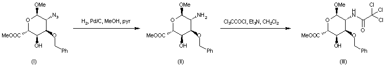 The altruronic acid derivative (III) was synthesized starting from the described glycoside (I). Reduction of the azido group of (III) by hydrogenation over Pd/C provided the corresponding amine (II), which was then acylated by means of trichloroacetyl chloride and triethylamine.