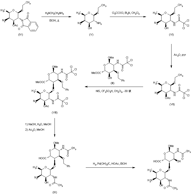 Hydrolysis of phthaloyl and acetyl groups of the galactose thioglycoside derivative (IV) by treatment with ethylenediamine afforded amine (V), which was subsequently converted to the trichloroacetamide (VI). Further acetylation of the hydroxyl group of (VI) employing Ac2O in pyridine produced the corresponding acetate ester (VII). Coupling of (VII) with the altruronic acid derivative (III) was carried out via activation of the thioglycoside by means of N-iodosuccinimide and triflic acid to furnish the fully protected disaccharide (VIII). Basic hydrolysis of the ester and amide groups of (VIII), followed by N-acetylation with Ac2O in MeOH yielded the diacetamido derivative (IX). Finally, hydrogenolytic cleavage of the O-benzyl group of (IX) with simultaneous azide reduction afforded the target disaccharide.