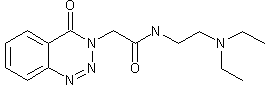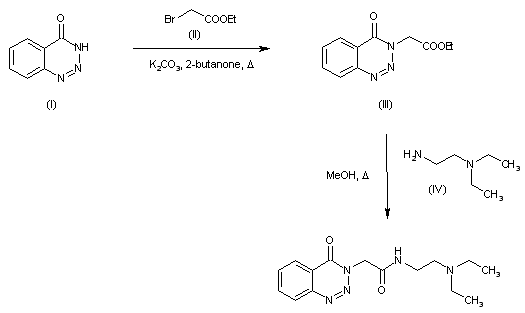 Condensation of 1,2,3-benzotriazin-4(3H)-one (I) with ethyl bromoacetate (II) in refluxing butanone afforded the 3-(ethoxycarbonylmethyl) derivative (III). The ethyl ester group of (III) was then converted into the target amide by reaction with N,N-diethylethylenediamine (IV) in hot MeOH