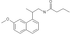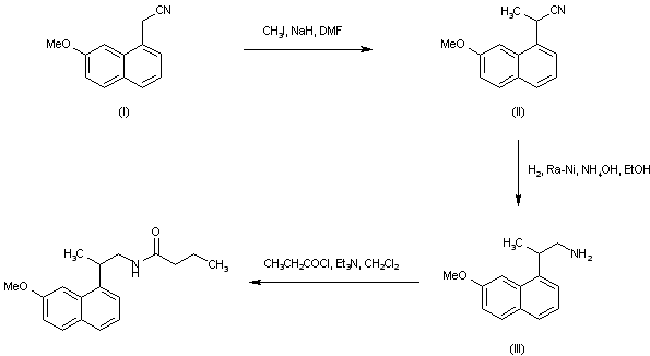 Alkylation of (7-methoxy-1-naphthyl)acetonitrile (I) with iodomethane in the presence of NaH gave the corresponding naphthylpropionitrile (II), which was reduced to amine (III) by catalytic hydrogenation over Raney-Ni. Finally, condensation of (III) with butyryl chloride in the presence of triethylamine provided the title butyramide.