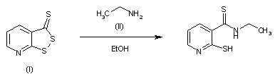 The target compound can be obtained by treatment of 3H-1,2-dithiolo[3,4-b]pyridine-3-thione (I) with ethylamine (II) in refluxing EtOH.