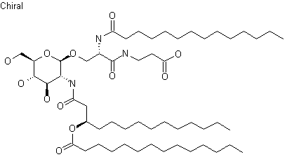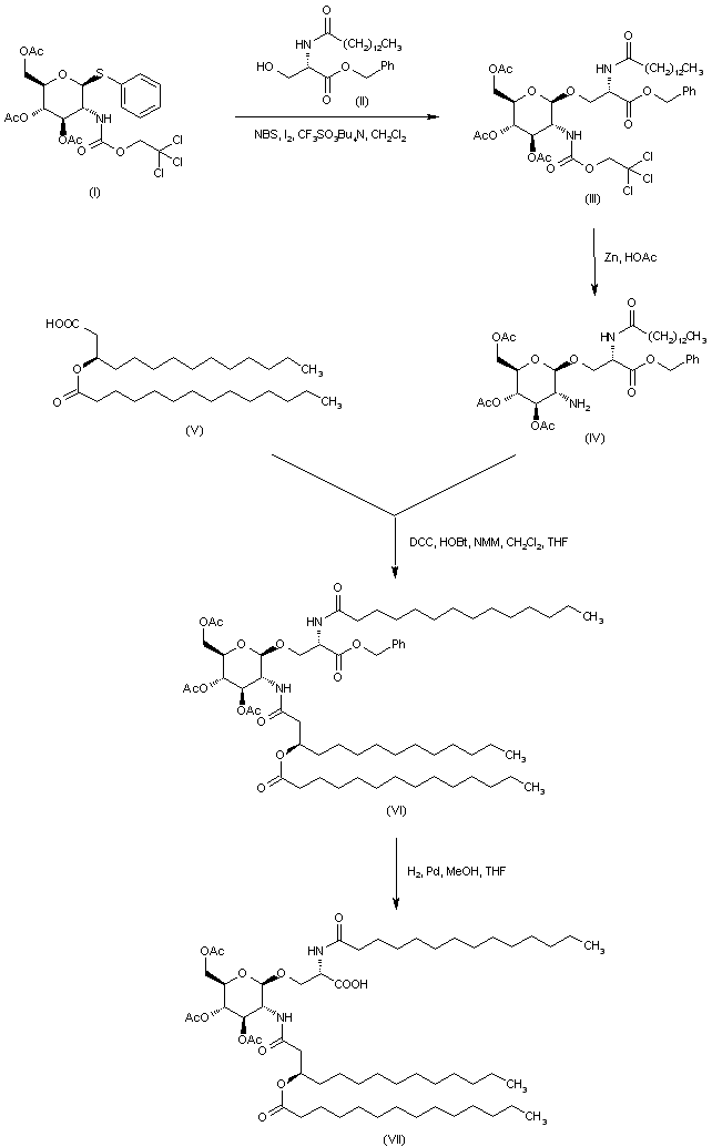 Phenylsulfanyl glycoside (I) was coupled with serine derivative (II) in the presence of N-bromosuccinimide, iodine and tetrabutylammonium triflate yielding the serine glycoside (III). Reductive cleavage of the trichloroethoxy carbonyl group of (III) with Zn and HOAc afforded amine (IV), which was acylated with (R)-3-(tetradecanoyloxy)tetradecanoic acid (V) using DCC and HOBt. Hydrogenolysis of the benzyl ester (VI) over palladium black provided carboxylic acid (VII).