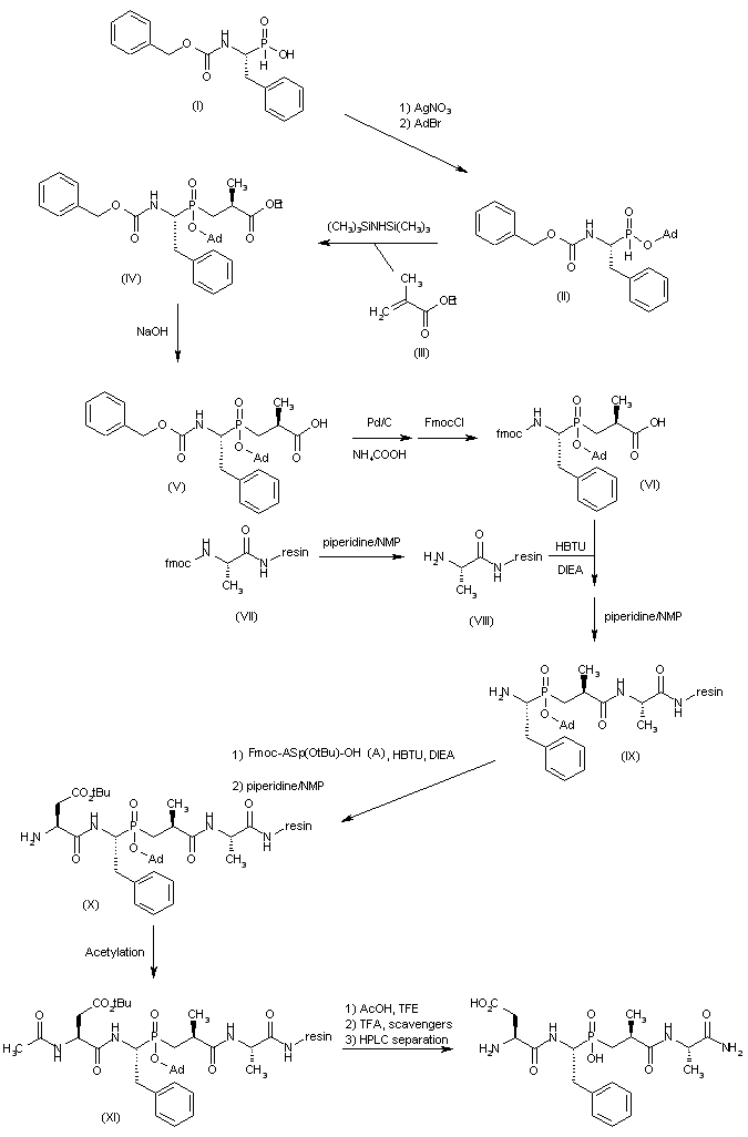 Protection of the hydroxyphosphinyl function of Z-Phe(PO2)H (I) by treatment with AgNO3 and 1-adamantyl bromide (AdBr) affords protected compound (II). Treatment of (II) with ethyl methylacrylate (III) by means of hexamethyldisilazane provides compound (IV), which is then subjected to saponification with NaOH in EtOH, affording carboxylic acid (V). The Z protecting group of (V) is then removed with Pd/C and ammonium formate, and subsequent reaction with FmocCl in dioxane yields protected derivative (VI). Separately, on resin protected alanine (VII) is treated with piperidine/NMP for Fmoc removal to afford (VIII), which is then coupled with phosphinic derivative (VI) by means of HBTU/DIEA in NMP and then treated with piperidine/NMP for Fmoc removal, giving derivative (IX). Coupling between (IX) and FmocAsp(OtBu)OH by means of HBTU and DIEA in NMP followed by Fmoc removal with piperidine/NMP affords phosphinic peptide (X), which is then acetylated to give derivative (XI). Finally, the desired product is obtained after first treatment of (XI) with HOAc and trifluoroethanol (TFE) in CH2Cl2 for cleavage of the protected peptide from the resin, followed by removal of the protecting groups with TFA and scavengers (thioanisole, phenol, ethanedithiol and triisopropylsilane) in CH2Cl2/H2O and final separation of the diastereoisomeric forms of the resulting phosphinic peptides by HPLC.