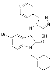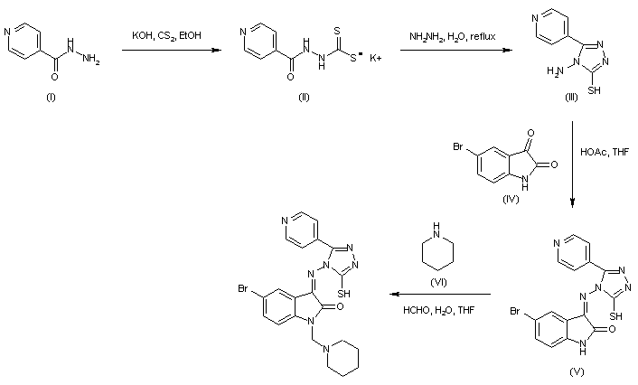 Isoniazid (I) was treated with carbon disulfide and KOH to give potassium 4-pyridyl dithiocarbazinate (II). Cyclization of (II) in the presence of hydrazine produced the amino triazole (III). This was condensed with 5-bromoisatin (IV), yielding the imino adduct (V). Finally, Mannich reaction of (V) with piperidine (VI) and formaldehyde furnished the title compound.