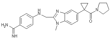 The alkylation of 2-methylbenzimidazole (I) with 4-chloro-3-nitrobenzyl chloride (II) provided adduct (III). Displacement of the chlorine atom of (III) with methylamine furnished the nitro aniline (IV), which was further reduced to phenylenediamine (V) by catalytic hydrogenation over Raney-Ni. Acylation of (V) by N-(4-cyanophenyl)glycine (VI) using N,N?carbonyldiimidazole as the activating reagent yielded amide (VII). The bis-benzimidazole compound (VIII) was then produced by cyclization of (VII) in refluxing HOAc. Finally, Pinner reaction of nitrile (VIII) with ethanolic HCl, followed by treatment of the resulting imidate with ammonium carbonate, provided the target amidine.