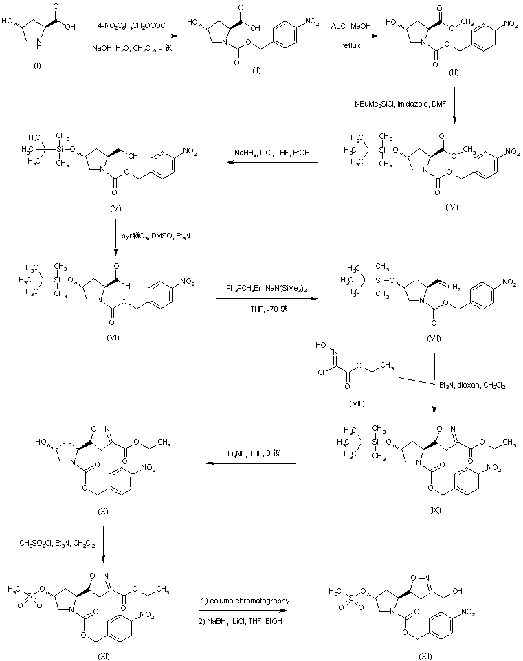 Treatment of trans-4-hydroxy-L-proline (I) with p-nitrobenzyl chloroformate gave the N-protected 4-hydroxyproline (II), which was esterified to afford the N-protected methyl ester (II). Protection of the hydroxyl group of (III) with t-butyl-dimethylsilyl chloride in the presence of imidazole, followed by reduction of the resulting ester (IV) with lithium borohydride, provided the alcohol (V). This was oxidized using pyridine-sulfur trioxide complex to give the formylpyrrolidine (VI). The vinylpyrrolidine (VII) was obtained by Wittig reaction of aldehyde (VI) with methylene triphenylphosphorane. Dipolar cycloaddition of the nitrile oxide resulting from ethyl chlorooximidoacetate (VIII) and Et3N to vinylpyrrolidine (VII) gave iso-oxazolidine (IX) as a mixture of diastereoisomers. After desilylation of (IX) with tetrabutylammonium fluoride, the resulting alcohol (X) was converted into the diastereomeric mixture of mesylates (XI). Chromatographic separation of the required isomer, followed by reduction with LiBH4, yielded alcohol (XII).