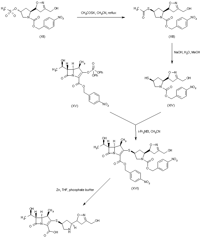 Displacement of the mesylate group of (XII) with potassium thioacetate gave thioester (XIII), which was further hydrolyzed to thiol (XIV). This was condensed with enol phosphate (XV) to afford the protected 1-methylcarbapenem (XVI). Finally, deprotection of the p-nitrobenzyl groups of (XVI) by zinc powder in the presence of phosphate buffer (pH 6.0) provided the title compound.