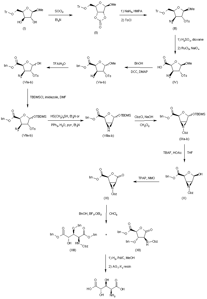 Treatment of trityl-protected ribofuranoside derivative (I) with SOCl2 and Et3N affords intermediate (II), which is then subjected to a nucleophilic substitution with NaN3 in HMPA and to tosylation with p-TsCl in pyridine to provide (III). Trityl removal of (III) by treatment with H2SO4 in dioxane followed by Sharpless oxidation of the free hydroxyl group with RuCl3 and NaIO4, yields uronic acid derivative (IV), which is then protected with benzyl alcohol, DCC and catalytic DMAP in CH2Cl2 to yield benzyl ester (V). Hydrolysis of (V) with aqueous TFA affords furanose (VI), which is silylated by means of TBS-Cl and imidazole in DMF to provide (VII). Reduction of the azide moiety of (VII) by treatment with 1,3-propanedithiol and Et3N in MeOH, followed by cyclization with Et3N, in DMF gives (VIII). Alternatively, aziridine (VIII) can be obtained by heating (VII) in pyridine in the presence of PPh3, H2O and Et3N. Treatment of (VIII) with Cbz-Cl in CH2Cl2 and aqueous NaOH yields a mixture of alpha- and beta-anomers (IX), which is desilylated without separation step by using tetrabutyl ammonium fluoride (TBAF) in THF in the presence of HOAc to provide beta-hydroxy anomer (X). Oxidation of (X) by means of tetrapropylammonium perruthenate (TPAP) and N-methylmorpholine N-oxide (NMO) in acetonitrile allows obtaining aziridino-gamma-lactone (XI), which then reacts with benzyl alcohol and BF3稥t2O in CHCl3 to give amino acid (XIII) and its lactonized derivative (XII). Both products are finally deprotected by hydrogenolysis over Pd/C in MeOH and the resulting products are separated by a basic anion exchange column (AG1-X4).