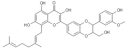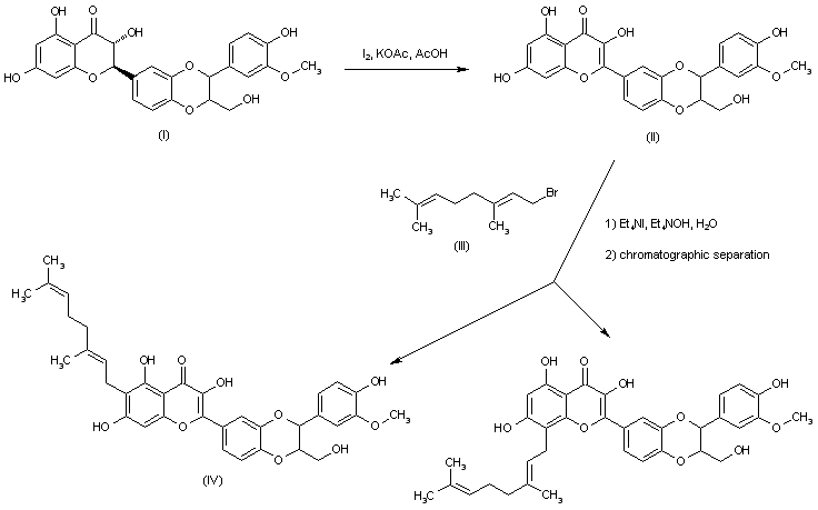 Commercial silybin (I) was oxidized to dehydrosilybin (II) employing iodine and KOAc in HOAc. Alkylation of (II) with geranyl bromide (III) in the presence of tetraethylammonium hydroxide provided a mixture of the desired 8-geranyl dehydrosilybin along with minor amounts of the 6-geranyl isomer (IV), which were separated by chromatography.