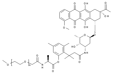Coupling of 2,5-dimethylphenol (I) with methyl 3,3-dimethylacrylate (II) by means of methanesulfonic acid yields dihydrocoumarin (III), which is reduced with LiAlH4 in THF to provide alcohol (IV). Selective O-protection at the primary hydroxy group of (IV) with tert-butyldimethylsilyl chloride (TBDMS-Cl) and Et3N in dichloromethane affords compound (V), which is then coupled with Boc-Ala-OH (VI) by means of EDC and DMAP in dichloromethane to give ester (VII). O-Deprotection of (VII) with HOAc in THF/H2O furnishes alcohol (VIII), which is then oxidized by means of pyridinium chlorochromate (PCC) in dichloromethane, giving aldehyde (IX). Compound (IX) is further oxidized with NaClO2 and sodium sulfite (Na2CO3) in H2O and NaH2PO4 in acetonitrile to yield propionic acid (X), whose Boc group is removed by treatment with TFA in dichloromethane, furnishing hydrochloride (XI). Coupling of (XI) with PEG thiazolidinethione (T-PEG) (XII) (1) by means of DIEA in dichloromethane gives PEG-alaninyl derivative (XIII), which is finally condensed with daunorubicin hydrochloride (XIV) by means of EDC ?HCl, HOBt and NMM in dichloromethane to afford the target product.