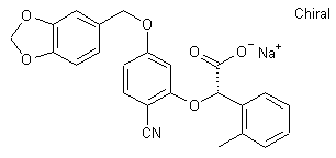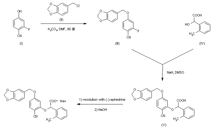 The title compound has been prepared by two related ways. The alkylation of 2-fluoro-4-hydroxybenzonitrile (I) with 3,4-(methylenedioxy)benzyl chloride (II) afforded ether (III). This was coupled with (R,S)-2-hydroxy-2-(2-methylphenyl)acetic acid (IV) in the presence of NaH in DMSO to produce the racemic adduct (V). Resolution was then achieved by fractional crystallization of the diastereoisomeric salts with (-)-ephedrine to furnish the desired (S)-enantiomer, which was finally isolated as the corresponding sodium salt.