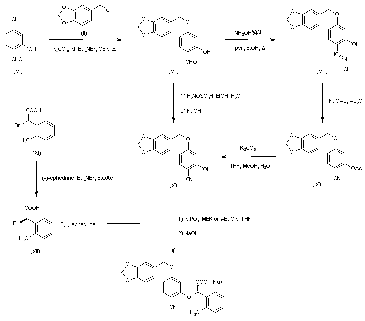 In a related procedure, alkylation of 2,4-dihydroxybenzaldehyde (VI) with chloride (II) gave ether (VII). Subsequent conversion of the aldehyde group of (VII) into the desired nitrile (X) was effected by the following sequence, including formation of the corresponding oxime (VIII), dehydration with concomitant acetylation using Ac2O, and then hydrolysis of acetate (IX) using K2CO3. Alternatively, aldehyde (VII) was directly converted to nitrile (X) by reaction with hydroxylamine-O-sulfonic acid, followed by basic treatment. Racemic alpha-bromo-(2-methylphenyl)acetic acid (XI) was resolved via formation of the corresponding salt with (-)-ephedrine (XII). Hydroxy nitrile (X) was then alkylated with the chiral bromide (XII), and the resulting compound was finally converted to the corresponding sodium salt.