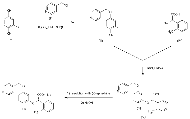 The alkylation of 2-fluoro-4-hydroxybenzonitrile (I) with 4-picolyl chloride (II) afforded ether (III). This was coupled with (R,S)-2-hydroxy-2-(2-methylphenyl)acetic acid (IV) in the presence of NaH in DMSO to produce the racemic adduct (V). Resolution of (V) was then achieved by fractional crystallization of the diastereoisomeric salts with (-)-ephedrine to furnish the desired (S)-enantiomer, which was finally isolated as the corresponding sodium salt.