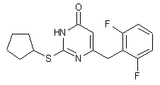 The condensation of 2-(2,6-difluorophenyl)acetic acid (I) with 2-methylmalonic acid monoethyl ester sodium salt (II) gives 4-(2,6-difluorophenyl)-2-methyl-3-oxobutyric acid ethyl ester (III), which is cyclized with thiourea (IV) to yield 6-(2,6-difluorobenzyl)-5-methyl-2-thioxo-1,2,3,4-tetrahydropyrimidin-4-one (V). Finally this compound is reacted with cyclopentyl chloride (VI) by means of K2CO3 to afford the target pyrimidinone.