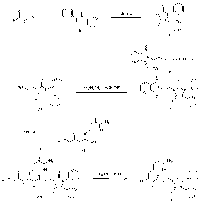The condensation of ethyl allophanate (I) with diphenylhydrazine (II) produced 1,2-diphenylurazole (III). Alkylation of (III) with N-(2-bromoethyl)phthalimide (IV) in the presence of potassium tert-butoxide afforded the 4-(2-phthalimidoethyl)urazole (V), and the subsequent hydrazinolysis of the phthalimide group of (V) yielded the amino derivative (VI). Then, coupling of (VI) with N-(benzyloxycarbonyl)arginine (VII) via activation with 1,1'-carbonyldiimidazole (CDI) furnished amide (VIII). Deprotection of the N-benzyloxycarbonyl group of (VIII) to give (IX) was effected by catalytic hydrogenation over Pd/C.