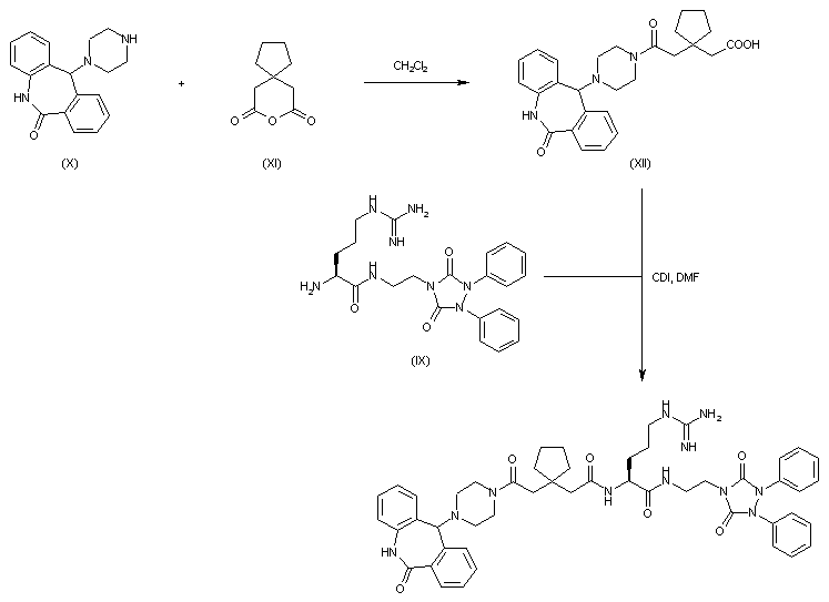 Condensation of piperazinyl dibenzoazepinone (X) with 3,3-tetramethyleneglutaric anhydride (XI) produced piperazide (XII). Further condensation of (XII) with arginine derivative (IX) using CDI yielded the title compound.